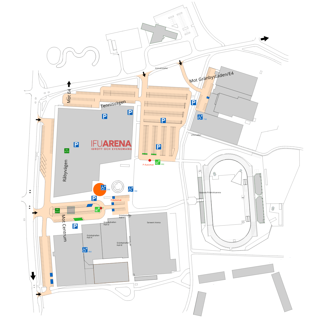 På Gränby Sportfält och i direkt anknytning till IFU Arena finns det ca 800 parkeringsplatser enligt nedan karta. Parkeringsautomaterna är kontantfria och betalningssätten är via angivna appar eller med kort.